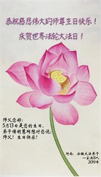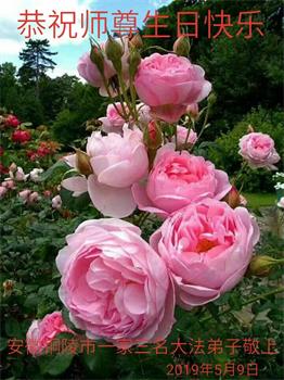 安徽省阜阳市一大法弟子恭祝慈悲伟大的师尊生日快乐!恭祝世界法轮大法日! 谢师恩 师父慈悲法伟大, 救度苍宇你我他 众生心存真、善、忍 诚心敬念有福份 牢记“法轮大法好” 祛病健身除祸根 弟子有幸得大法 感恩之词世难寻 踏实做好三件事 学法修心去执着 讲清真相揭谎言 正念除恶救世人 内找不足再精進 兑现誓约是本份 师尊华诞送祝愿 恭祝世界大法日 各界众生齐叩首 跪拜师尊表寸心 万千心声化一句 永谢师尊救度恩 二零一九年五月九日 |