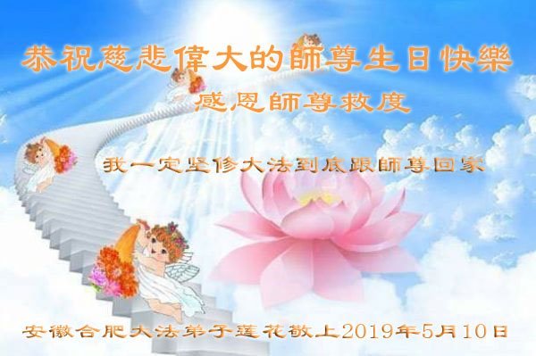 合肥全体大法弟子合十恭祝:师尊生日快乐!普天同庆世界法轮大法日! 二零一九年五月九日 安徽省合肥市一大法弟子恭祝师尊生日快乐!