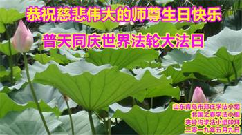 山东省青岛大法弟子恭祝慈悲伟大的师父生日快乐!同颂、同贺世界法轮大法日!