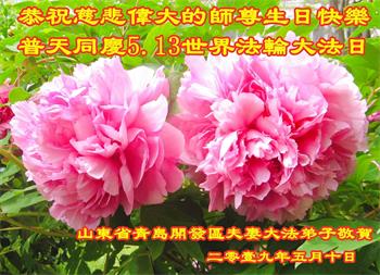 山东省青岛开发区夫妻大法弟子恭祝慈悲伟大的师尊生日快乐!暨普天同庆5.13世界法轮大法日!