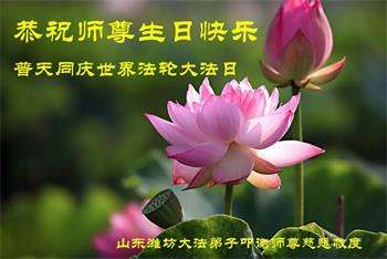 山东省潍坊市奎文区一学法小组大法弟子恭祝师尊生日快乐!庆贺世界法轮大法日! 山东省潍坊市潍城区一学法小组大法弟子恭祝师尊生日快乐!庆贺世界法轮大法日! 山东省潍坊市商业界大法弟子恭祝师尊生日快乐!庆贺世界法轮大法日! 山东潍坊临朐一夫妇大法弟子恭祝慈悲伟大的师尊生日快乐!