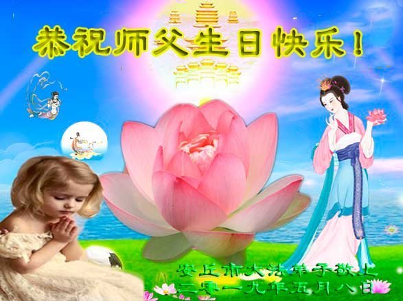 师尊您好: 师父您辛苦了,感谢师父一次次救度,看护着弟子。弟子时时提醒自己提高心性,修去人心,不被人心带动,学好法,向内找,修好自己,才能救度更多众生。圆满随师还。 祝师父生日快乐!愿师父开心快乐! 潍坊学法小组大法弟子敬上 2019年5月8日 山东省潍坊一大法弟子恭贺师尊华诞暨世界法轮大法日!