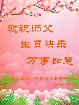 感恩师尊的慈悲苦度,弟子只有听师尊的话,修好自己,做好三件事,走好最后的路,随师回家。 重庆市巴南区长江学法小组全体弟子合十 二零一九年五月 重庆市巴南区一家三位大法弟子敬祝师父生日快乐!