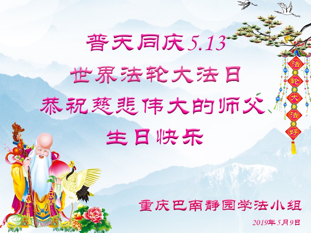 在5.13世界法轮大法日!这普天同庆的日子里,我们学法小组全体大法弟子祝慈悲伟大的师父生日快乐! 叩谢师尊慈悲苦度,用心学好法,学法入心,正念正行,做好三件事,多救人。在最后不多日子里,精進、再精進,圆满随师还。 重庆市巴南区静园学法小组大法弟子 二零一九年五月 重庆长安地区大法弟子恭祝师尊生日快乐!