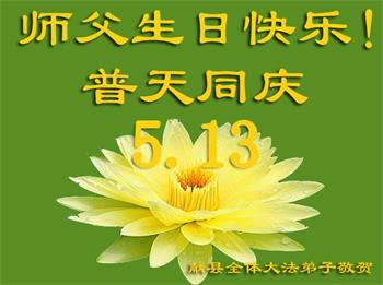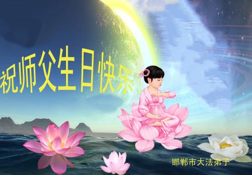 师父您好,您辛苦了!大法弟子及全家恭祝恩师生日快乐!普天同庆五一三这个殊胜的日子。师父层层下走到人间、洪恩浩荡救度众生!愿世人快快醒悟,明真相,得到大法救度,这才是生命的真正宿愿。修炼人在各种魔难中要修出来,兑现誓约,完成使命。正念正行,坚定修炼,跟师父返回到美好幸福的新宇宙家园。 河北省邯郸市大法弟子祝师父生日快乐!感谢师父慈悲救度!