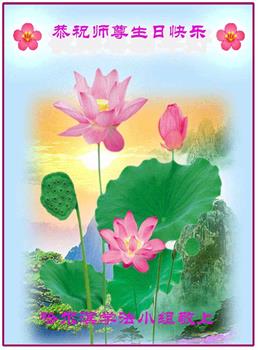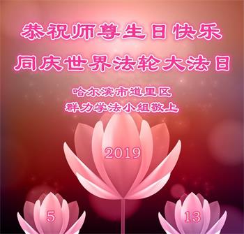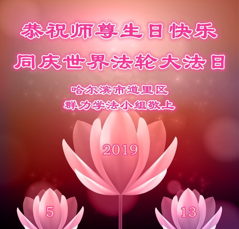 【明慧网二零一九年五月十一日】 黑龙江哈尔滨市道里区一学法小组大法弟子恭祝师尊生日快乐!同庆世界法轮大法日!