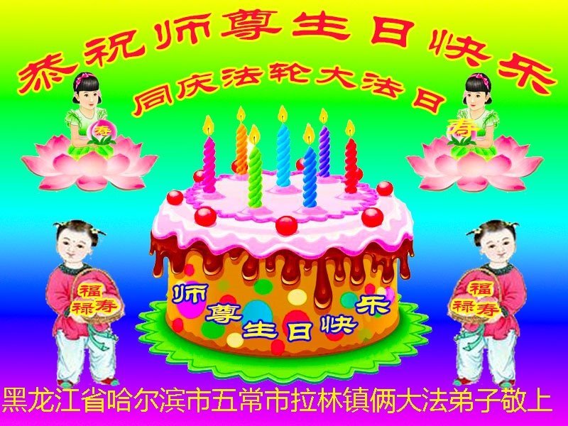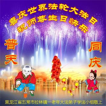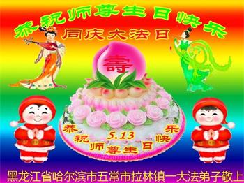 师尊好! 五月十三日是“世界法轮大法日”暨法轮大法洪传二十七周年纪念日,也是慈悲伟大师尊的华诞日,一老年大法弟子学法小组在边远小镇遥祝师尊生日快乐!谢谢师尊的慈悲苦度!叩拜师尊! 哈尔滨市五常市拉林镇一老年大法弟子学法小组敬上 黑龙江省哈尔滨大法弟子恭祝师尊生日快乐!