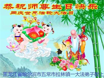 黑龙江省哈尔滨市五常市拉林镇俩大法弟子恭祝师尊生日快乐!