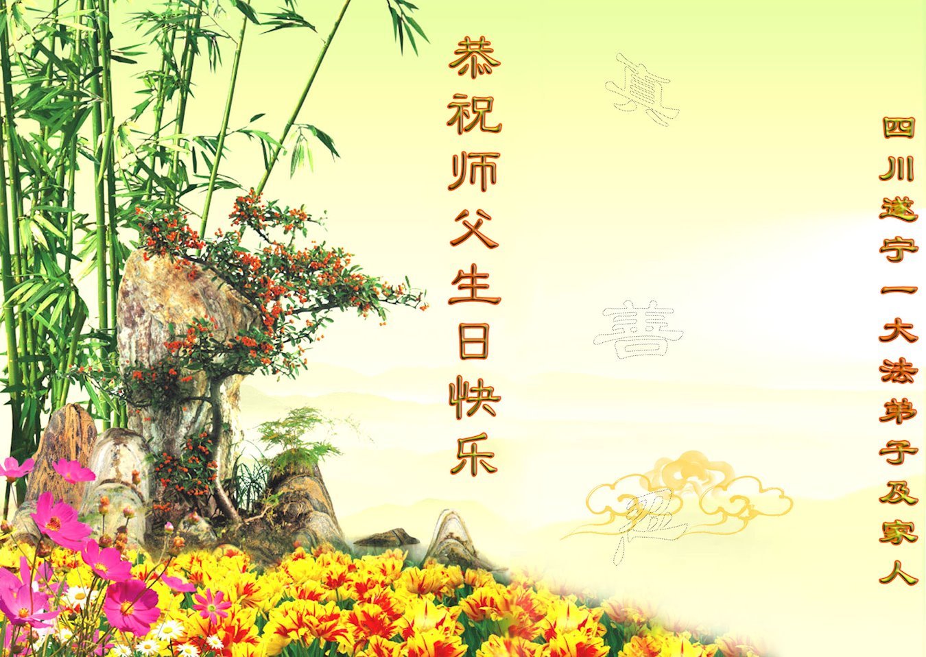 四川南充七人学法小组大法弟子恭祝师父生日快乐!