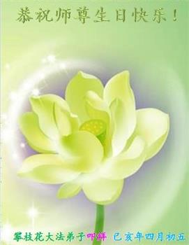 尊敬的师父:您好!师尊为救度宇宙众生辛苦了! 在这普天同庆的神圣时刻,弟子恭祝慈悲伟大的师尊生日快乐!弟子无限感谢师尊对弟子的慈悲苦度!是师尊把弟子从地狱中捞起,用巨大的承受为弟子削去罪业,一直看护着、保护着我的生命,把身、心残疾的我引上宇宙大法修炼路,用大法把弟子心灵洗净,使弟子在返本归真的人生目标路上勇往直前,按真、善、忍标准作最好之人;是师尊赋予弟子救度众生的历史使命,教会弟子用宽容去谅解包容别人,用慈悲去完成师尊交给弟子的使命去救度众生和世人。 弟子的一生中,在二十年随师正法修炼中,都是师尊的一路无微不至的细心保护,是大法给了我正念和勇气,给了我生命的新生,使我在邪恶迫害的日子里,没有退缩过,都坚定的走在修炼大法的路上,同时在其中也经历了一些美好的事情。是师尊一路保护,我的生命、我的修炼、我的一切才能稳健的走到今天。弟子走过的每一步都离不开师尊的巨大操劳和无量付出,师尊为弟子真是操尽了心!对师尊的洪大慈悲佛恩,弟子用尽人类语言也无法表达我对师父的无限感恩!师恩浩荡,师恩难报!弟子修的离师父的要求差的还远,在修炼中做得还有很多的不好、不足、有漏,甚至有时还让师尊在梦中或借家人之口点醒弟子的过错,弟子对此也深感愧对师尊。 请师尊放心,弟子决不灰心。在这开天辟地都没有过的佛恩浩荡里一定精進、再精進,珍惜这万古机缘!弟子会精進赶上,认真学法努力修好自己,用大法努力归正自己的一言一行,达到大法的修炼标准,认真做好三件事,加强正念,努力去掉观念和思想业,做好师尊安排的各项事情,多多救人兑现自己的誓约,不辜负师父对弟子的慈悲苦度! 无限感恩师尊!感恩大法! 四川一名大法弟子 2019年5月9日 四川省绵阳市三台全体大法弟子恭祝师尊生日快乐!恭贺世界法轮大法日!