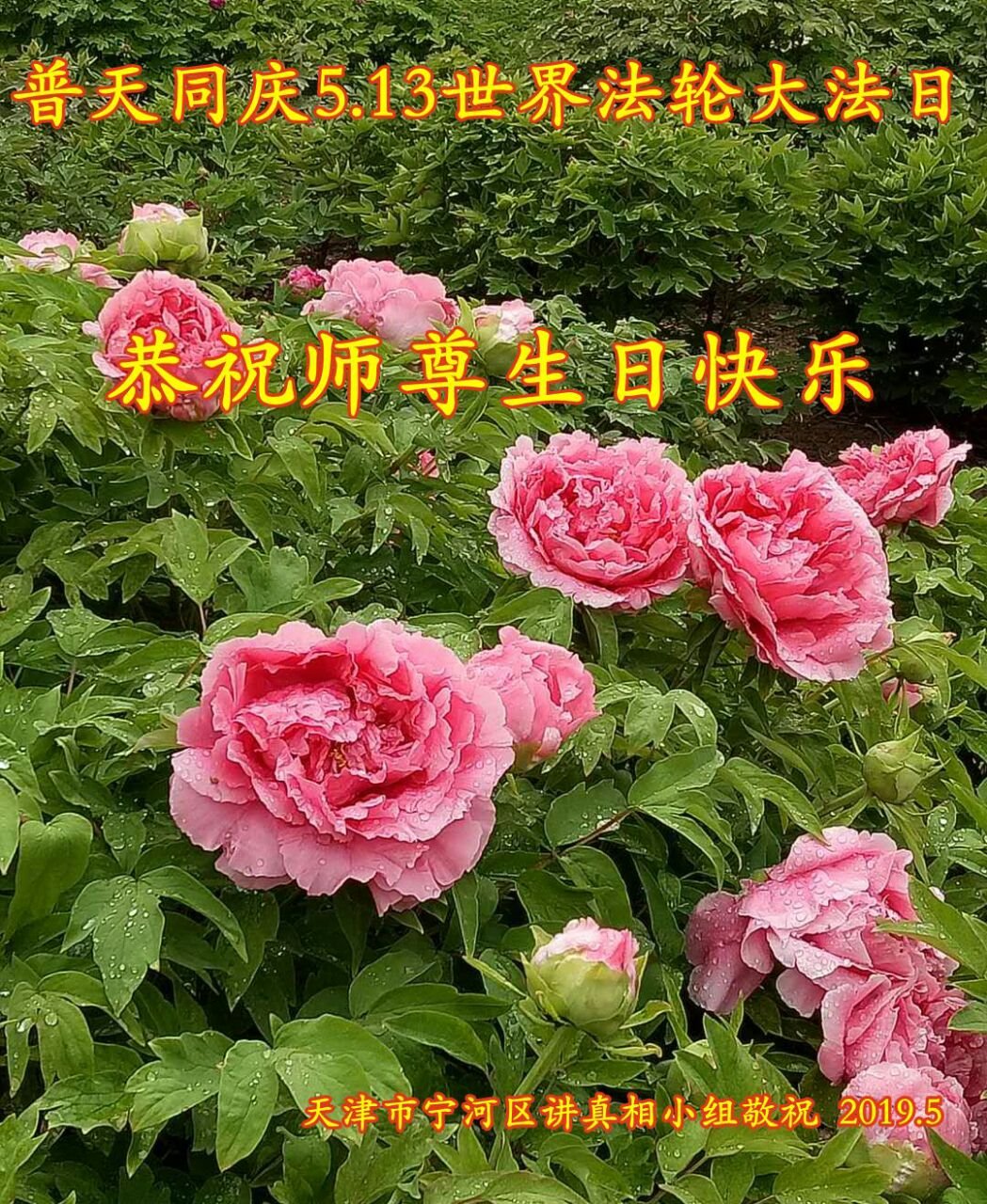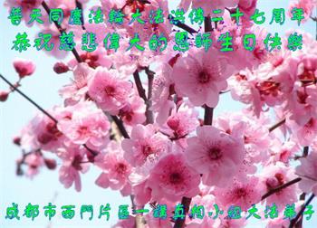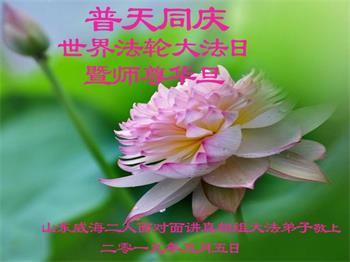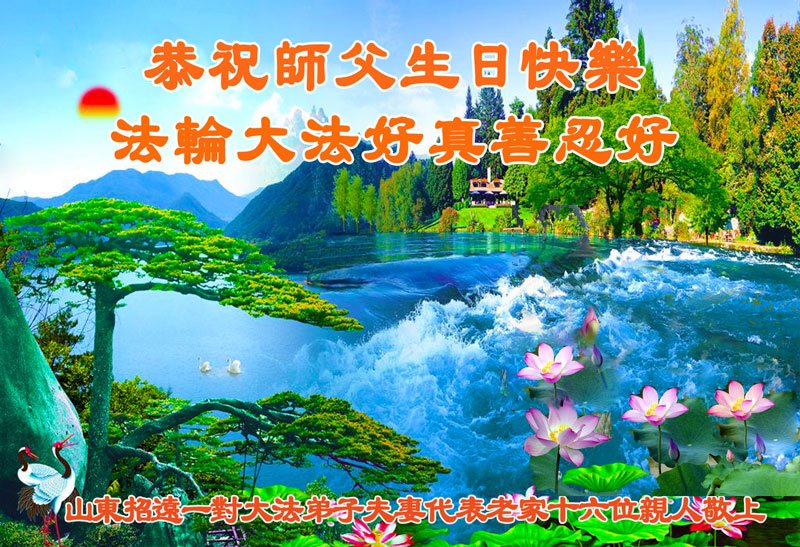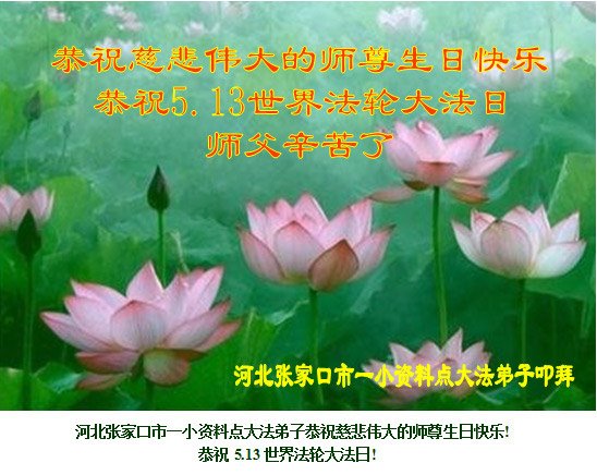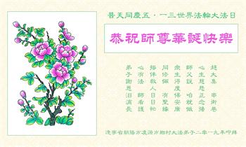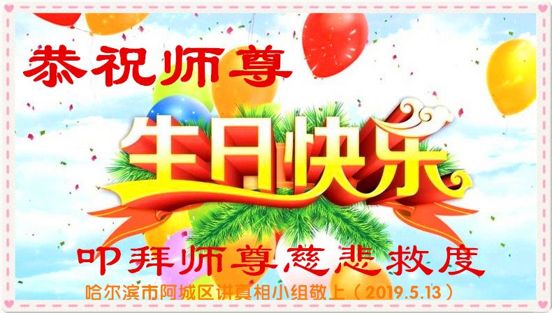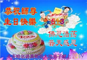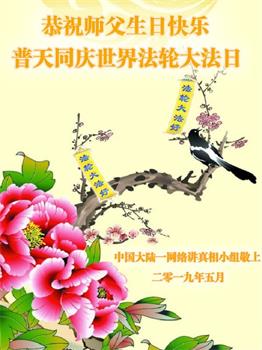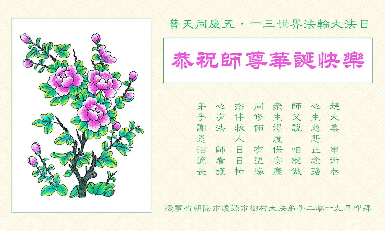 | 【明慧网二零一九年五月十一日】(明慧网记者综合报道)二十七年前的五月十三日,法轮大法开传,象一股清流,使中国民众看到了道德回升的一片净土。二十七年来,法轮大法造就了众多慈悲善良、敢于走真理之路的大法修炼人。在中共的打压迫害中,他们不畏艰难和危险,把大法的福音传遍城市和乡村,告诉给千家万户。 在法轮大法洪传二十七周年之际,在大法中受益并辛勤的传播“法轮大法好”的法轮功学员们纷纷向明慧网发来贺信,恭祝慈悲伟大的李洪志师父华诞快乐!同庆第二十届世界法轮大法日! 辽宁省凌源市乡村大法弟子在他们的小诗中说: 赶大集 串街巷 心生慈悲正念强 同修间 有圣缘 搭伴救人日日忙 师父说 咱就做 众生得救保安康 心有法 师看护 弟子谢恩泪滴长 哈尔滨市道里区一位大法弟子表示:“弟子修炼二十三年,家庭资料点已走过十五个年头,在修炼的路上,是师父的慈悲看护,带着弟子平稳的走到今天。如今,我丈夫也正式走入大法修炼,我们将继续走好最后的路。” 河北保定市易县大法弟子写道:五月百花盛开,万物充满活力与生机。大法弟子是当今世界瞩目的奇花,在亿花丛中,我是其中一朵小花,每一步都离不开师父的慈悲保护。 哈尔滨市一讲真相小组大法弟子恭祝师尊生日快乐!庆祝世界法轮大法日!中国大陆一网络讲真相小组大法弟子恭祝师父生日快乐!普天同庆世界法轮大法日!西安市俩人讲真相小组恭祝师尊生日快乐!庆祝法轮大法洪传二十七周年!救人忙 俩俩街上同心行 救人脚步不歇停 我发正念你开讲 苦口善心唤众醒 恶语相向心不动 慈悲正念细讲明 明白醒悟多声谢 退!党!团队保性命 兑现使命救众生 哪管春夏与秋冬 正念正行神路走 再苦再累乐其中 辽宁省凌源市乡村大法弟子恭贺世界法轮大法日暨师尊华诞!弟子叩拜慈悲伟大的师尊!恭贺世界法轮大法日!恭祝师尊生日快乐! 赶大集 串街巷 心生慈悲正念强 同修间 有圣缘 搭伴救人日日忙 师父说 咱就做 众生得救保安康 心有法 师看护 弟子谢恩泪滴长 山东招远一对大法弟子夫妻代表老家亲人恭祝师尊生日快乐!最近我们回临沂老家探亲,和十六位亲人欢聚一堂。他们看到我们夫妻俩身体健康、精神饱满,都为我们高兴。在饭桌上我们又详细的讲述了自己修炼大法的过程和体会。 有个外甥患直肠癌两年了(我们事前不知道),接受我们的建议,已在听师父讲法录音,开始念:“法轮大法好,真善忍好”。另一个外甥说:听您这么一说,我也想炼法轮功了。还有人说:你们这次回来,比七年前那次回来还显得年轻,气色更好了。他们都退出了各自加入过的中共组织。 我们代表家乡的亲人敬祝师父生日快乐! 辽宁东港市全体大法弟子恭祝伟大师尊生日快乐!恭贺世界法轮大法日!在过去的一年中,我们坚持集体学法向内修,增强了大法弟子助师正法救度众生的使命感、责任感,在师尊的慈悲保护下,我们整体配合,以纯正慈悲心讲真相救度众生,使更多正在参与迫害的公检法人员与政府部门人员明白了法轮大法救人的真相,使这些众生为自己的未来做出了正确的选泽,在放弃迫害,善待大法弟子中将功补过、赎回自己的未来! 弟子万分感恩师父对弟子慈悲苦度及世人的慈悲救度! 师父啊,弟子想念您! 东港市全体大法弟子恭祝 北京通州大法弟子恭祝师尊生日快乐!恭贺世界大法日!师尊,您辛苦了!祝你您生日快乐!在普天同庆的日子里,在您正法的最后时刻,我们一定要学好法,向内找,修好自己,牢记您的教诲,加紧时间做好三件事,整体升华、整体提高,让师尊少一份操劳,多一份欣慰,圆满随师父还。 北京通州区一讲真相小组大法弟子叩拜 2019年5月13日前夕 河北省三河市一讲真相小组大法弟子恭祝师尊生日快乐!四川成都老年大法弟子恭祝师尊生日快乐!师父,您好! 我们十九位天天出去讲真相的老年大法弟子,在师尊华诞来临之际,心怀万分感恩的心情衷心敬贺您生日快乐! 在您的慈悲保护下,我们才走到今天。人类的任何语言无法表达弟子们对您的感恩!我们唯有更加做好三件事,修好自己,继续走出家门面对面讲真相,尽全力救度世人,完成大法弟子的使命,兑现誓约,以报师恩!弟子唯愿师尊笑! 河北省唐山市古冶区一讲真相小组大法弟子恭祝师尊华诞!恭贺世界法轮大法日!师尊您辛苦了!弟子们在此叩拜师尊!纵有千言万语也无法表达弟子们对师尊的感恩。弟子们只有更加精進,在助师正法的最后时间里做好三件事,放弃人的一切执著,紧跟师父,圆满随师还。 哈尔滨市道里区大法弟子及家人恭祝师尊生日快乐!五月十三日是世界法轮大法日,也是师尊的生日,普天同庆!同贺!在此,弟子及家人跪拜师尊,恭祝师尊生日快乐! 用尽世间所有语言,也无法表达弟子对师尊的感恩! 弟子修炼二十三年,家庭资料点已走过十五个年头,在修炼的路上,是师父的慈悲保护,带着弟子平稳的走到今天。师父:弟子让您操心了,您辛苦了!如今,我丈夫也正式走入大法修炼,我们将继续走好最后的路,听师父的话,修好自己,多救人,迎接师尊回大陆的那一天。 哈尔滨市道里区大法弟子 河北保定市易县一中年大法弟子恭祝师父生日快乐!师父您好!您辛苦了! 五月是百花盛开,花香四溢,万物充满活力与生机的季节。大法弟子是当今世界瞩目的奇花,在亿花丛中,我只是最平常的那一朵小花。我悟性不高,智慧一般,在修炼路上