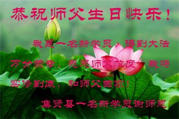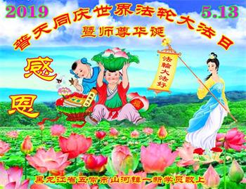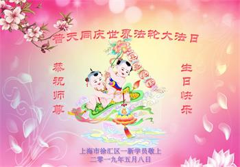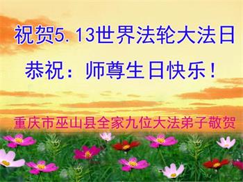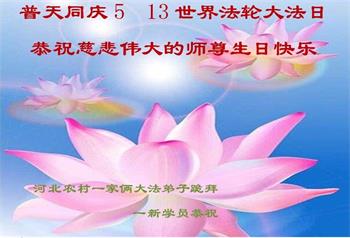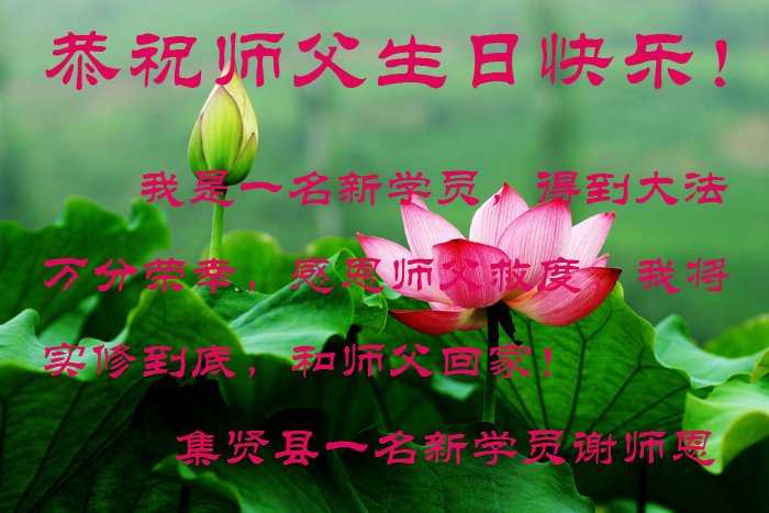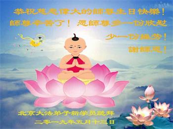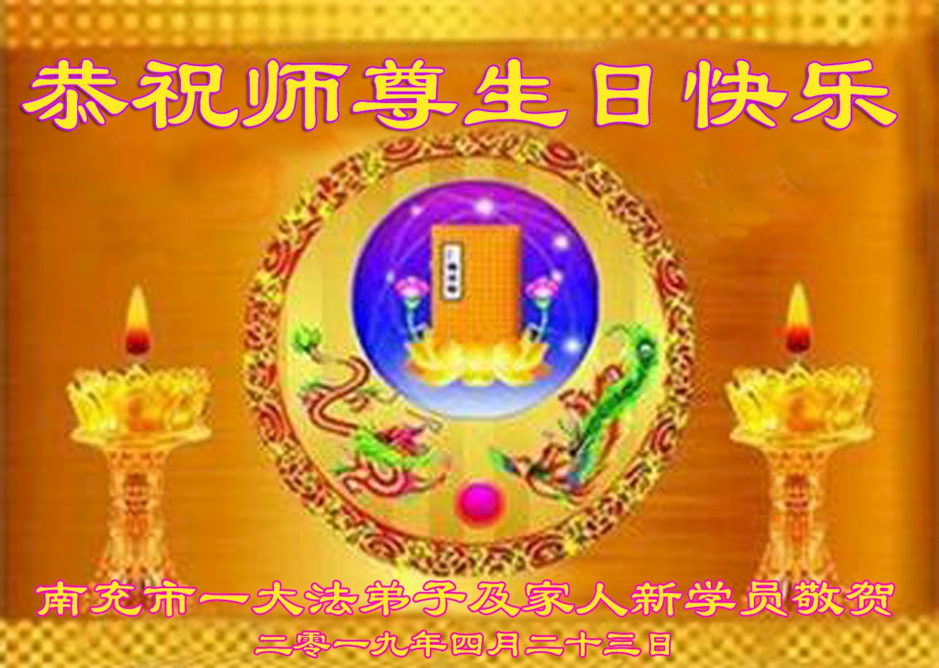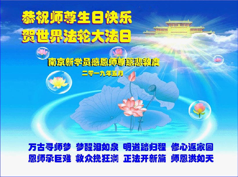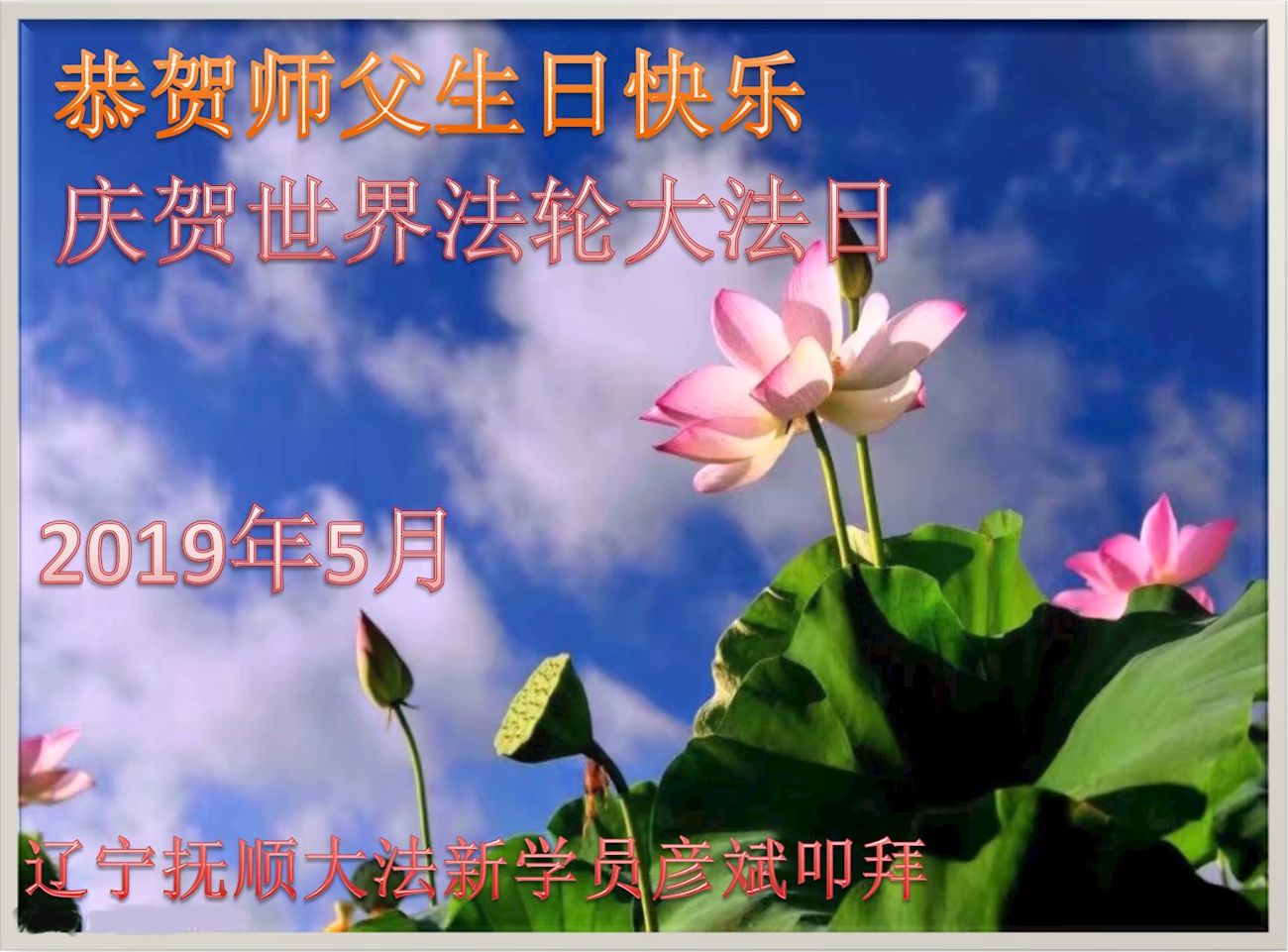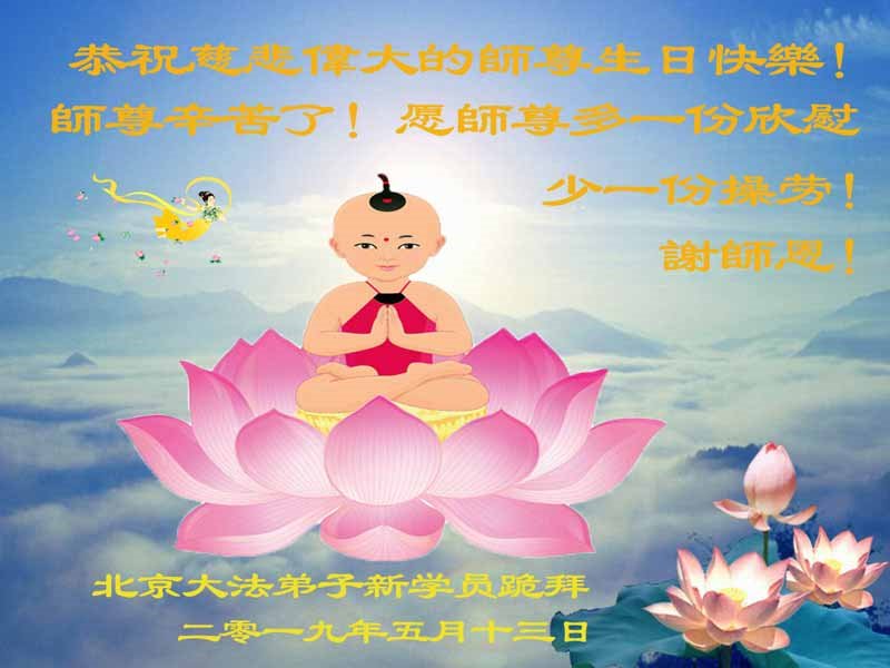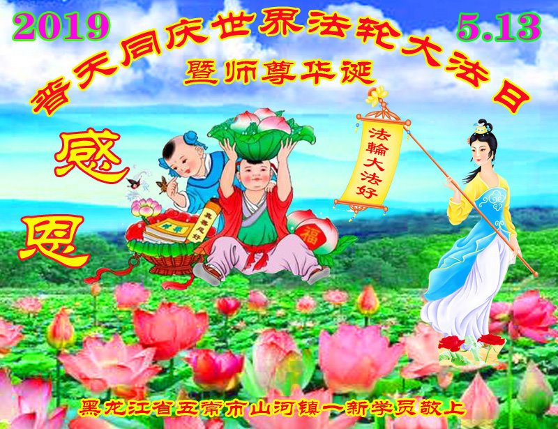 | 【明慧网二零一九年五月十一日】(明慧网记者综合报道)在第二十届“世界法轮大法日”节庆之日,中国各地刚刚步入法轮大法修炼的新学员感恩师尊救度! 从大兴安岭到广东潮汕,从内蒙古海拉尔到山东蒙阴,北京、上海、重庆、南京等各大城市,新疆、云南、甘肃等各省,法轮功新学员遍布中国各地。他们表示:感恩师尊把我们从中共的谎言中唤醒,从人世间的迷中唤醒,庆幸在师父正法的最后时刻自己能够得到大法的救度!他们说,走進大法修炼,才知道生命是何等的幸运与珍贵! 四川南充市顺庆区一新学员恭祝师尊生日快乐!上海一新得法女弟子恭祝慈悲伟大的师尊生日快乐!恭贺世界法轮大法日!师尊您好!在这普天同庆大法洪传二十七周年暨师父华诞之际,作为新得法的弟子无限感恩师尊的佛恩浩荡!在此跪谢师尊的慈悲救度! 辽宁沈阳一新学员恭祝师尊生日快乐!弟子感恩师尊慈悲救度,我会紧紧抓住这万古不遇的机缘,更加努力做好三件事,跟师尊回家。 湖南株洲市一刚得法的新学员恭祝师父生日快乐!我刚刚得法才两个月,可在我身上发生了很大变化!我通过学大法,知道了不失不得的关系,知道了做坏事骂人会失德,于是我改掉了动不动就骂我丈夫的坏习惯,买菜也不挑不选了。 我现在每天坚持学法炼功,按大法的要求做好人,以前的高血糖高血脂正常了,身体的不良现象都消失了,而且我的记性越来越好。有一次,我去买肉,那人忘记收我的钱,我准备去送钱,丈夫说我是不是搞错了。我记得每张钱的用处,肯定是买肉的人忘记了,我就把钱送去了。这在以前我是做不到的。 感谢师父教给我这么好的法,帮我消业,叫我做好人。谢谢师父! 新疆新学员恭祝师父生日快乐!谢谢师父慈悲苦度!师父辛苦了! 黑龙江省五常市山河镇一大法弟子恭贺世界法轮大法日暨师尊华诞!我是新学员,是师尊把我从病魔中解救出来。感恩师父的救命之恩! 内蒙古海拉尔大法新学员恭祝慈悲伟大的师尊生日快乐!广东省汕头市潮南区司马浦镇一位新得法学员恭祝师尊生日快乐!普天同庆世界法轮大法日!我得法前,饱受病痛折磨,找有名的医生治疗,喝中药时间达两年仍不见好转,苦不堪言。2016年下半年,幸遇大法弟子,从此我走上修炼之路。慈悲的师父迅速帮我净化身体,才几个月,就不用看医生不用喝中药,身体奇迹般的恢复了。 我衷心叩谢师父洪恩!弟子喜得大法,万分荣幸!用尽人间词汇都表达不尽师恩洪恩浩荡。弟子唯有勇猛精進,做好三件事,不辜负师父慈悲苦度。 喜迎世界法轮大法日的到来,恭祝师父节日快乐! 上海市徐汇区一新学员恭祝师尊生日快乐!暨世界法轮大法日!我是一名新学员,值此师尊生日来临之际,祝师尊生日快乐!弟子永遵师尊的教诲,做个真修弟子,跟师尊回家。 山东蒙阴一新学员和明真相的孩子们祝师尊生日快乐!我是一名新学员。法轮大法神奇,相信的人逢凶化吉、遇难呈祥,我和几个孩子都多次经历过。感谢师尊慈悲救度!我们全家感恩师尊!普天同庆世界法轮大法日! 甘肃省兰州市一新得法弟子及父母同修恭祝慈悲伟大的师尊生日快乐!感谢师尊慈悲救度!河南省周口市一新大法学员恭贺法轮大法日!慈悲伟大的师父好! 在世界法轮大法日到来之际,弟子向您保证一定精進实修,不负师尊的慈悲苦度。我会处处事事以真、善、忍归正自己,圆满随师还。 黑龙江黑河市新得法大法弟子恭贺世界法轮大法日!我是得法两年的新弟子,在正法進程的最后时刻我能够得法,真的是十分幸运,也万分感恩师尊的慈悲苦度。唯有在以后的日子里倍加珍惜,尽快的修好自己,早日跟上正法的進程,做好“三件事”以谢师恩! 重庆荣昌新学员恭贺法轮大法日!北京昌平大法新学员秋燕敬祝师父生日快乐!河北唐山市开平区大法新学员及全家恭祝慈悲伟大的师父生日快乐!恭贺第世界法轮大法日!我儿媳妇是新学员,学大法得福报了! 儿媳在北京工作,为人善良、贤淑,在整个大家族中口碑很好。遗憾的是结婚六年半没有孩子。在医院做了各种检查和治疗不见效,算命的说她这辈子不会有孩子。后来她跟我一起学法炼功,走進大法修炼。修炼也就一年时间,到医院检查说是怀孕了。预产期就在今年的五月十三日。她回到家第一件事就是给师父磕头谢师父!儿子也激动的给我打电话,让我去买好水果给师父上香,谢谢师父给了我们家一个孩子! 我们全家对师父的感恩无以言表。儿媳表示以后要好好修炼。 她的父亲以前反对大法,不相信大法,儿媳对他父亲说:你要不发表郑重声明就对不起师父,对不起大法,是大法师父赐给咱家的娃。她老父亲为此高兴的一宿没睡觉,在郑重声明上签了字。 在这普天同庆的日子里,我们无法用语言表达对师父的感恩,唯有精進实修,做好三件事,救度更多的众生! 叩谢师父! 北京大法新学员恭祝慈悲伟大的师尊生日快乐!北京大法弟子新学员跪拜! 四川广安一大法新学员恭祝师尊生日快乐!慈悲的师尊您好!师尊生日到了,弟子祝师尊生日快乐! 我是个新学员,修的不精進,让师尊操心了。在今后的修炼路上,我会听师尊话,用心做好三件事。师尊,您为弟子们和众生们操碎了心,弟子感恩师尊的慈悲救度!弟子叩拜师尊!祝师尊生日快乐! 四川广安一大法弟子合十敬上! 江苏省南京市全体大法新学员恭贺世界法轮大法日!辽宁省大连三位八十多岁新学员恭祝师尊生日快乐!恭