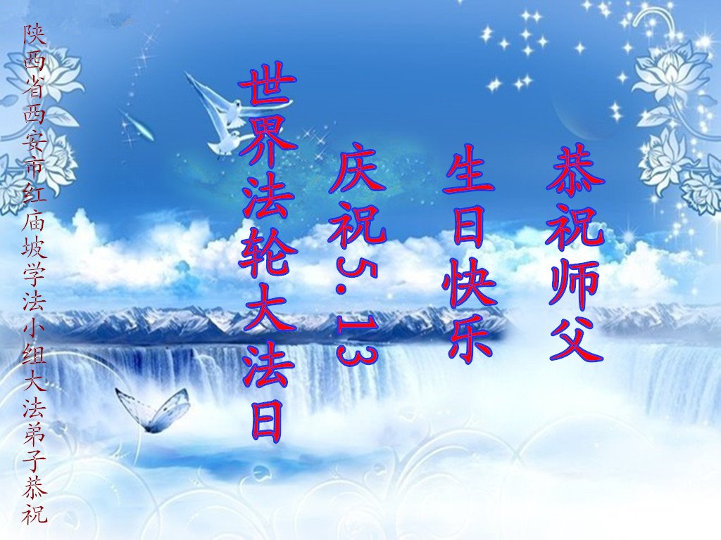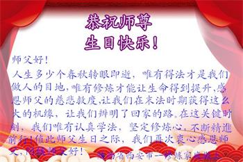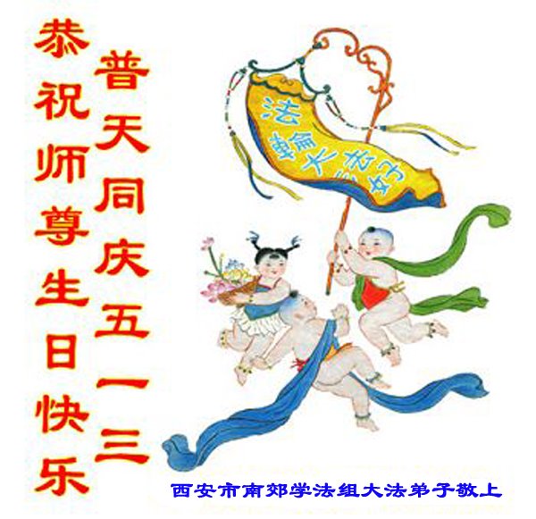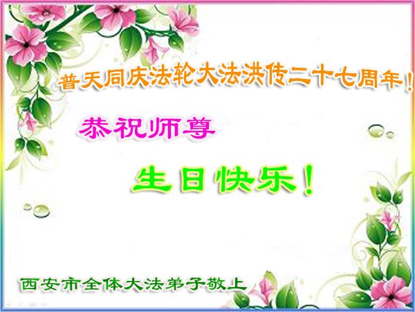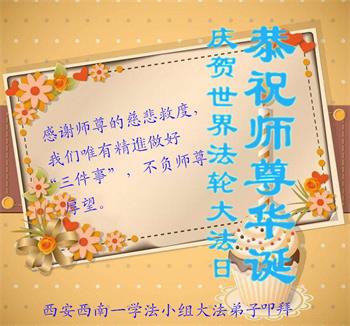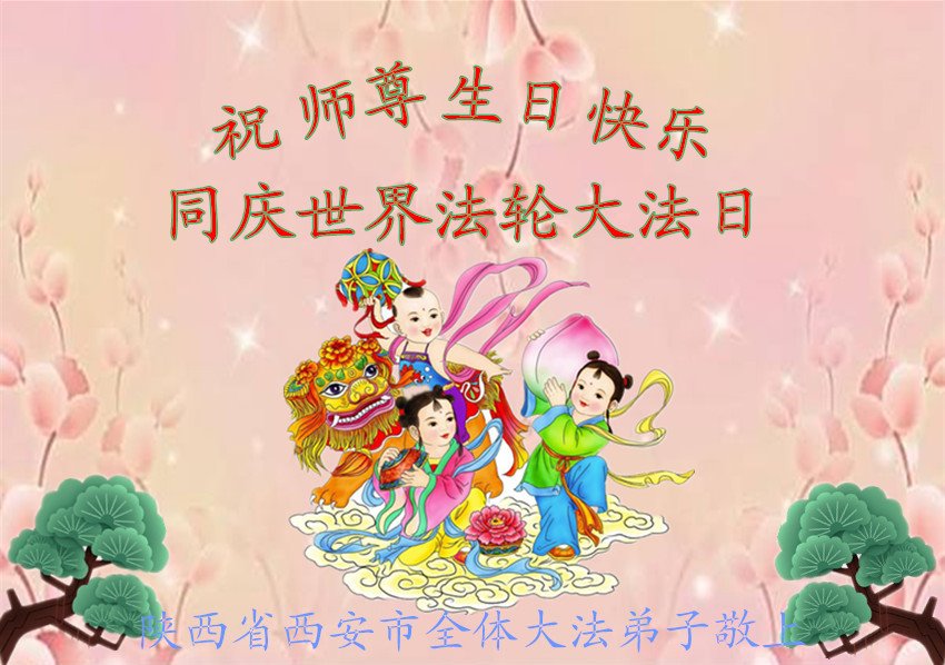 师父好!人生多少个春秋转眼即逝,唯有得法才是我们做人的目地,唯有修炼才能让生命得到提升,感恩师父的慈悲救度,让我们在末法时期获得这么大的机缘,让我们辨明了回家的路。在这关键时刻,我们唯有认真学法,坚定修炼心,不断精進前行!值此师父生日之际,我们再次衷心感恩师父,问候师父好! 陕西省西安一大法弟子恭祝师尊生日快乐!同庆世界法轮大法日!