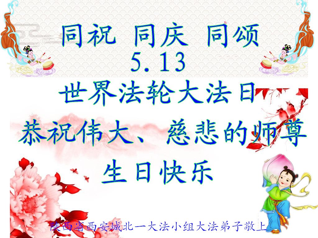 陕西省西安市全体大法弟子恭祝慈悲伟大的师尊大法弘传27周年!普天同庆513世界法轮大法日!恭祝师尊生日快乐! 陕西省西安市南郊学法组大法弟子恭贺5·13世界法轮大法日!