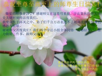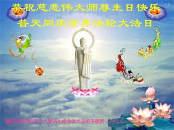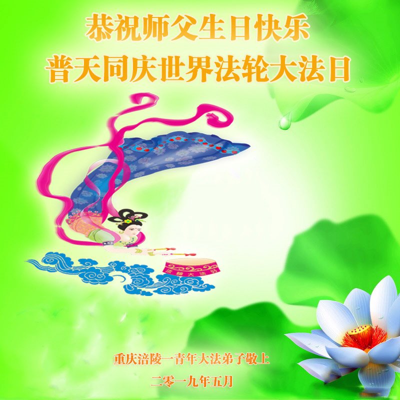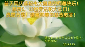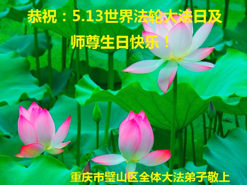 我们重庆沙坪坝清莲学法小组全体大法弟子恭祝慈悲伟大的师父生日快乐!同庆5.13第二十届世界法轮大法日!感恩师父的慈悲救度,把我们从迷中唤醒,带领我们走上了一条返本归真的修炼路,使我们明白了生命的真正意义。我们用“真、善、忍”的标准归正自己,身体逐步得到净化,生命得到升华,我们是多么的幸运!我们无法用人类的语言来表达对师父的感恩,唯有在最后不多的时间里,学好法,修好自己,去除各种各样的人心,真正从人中走出来,精進实修,做好三件事,多救众生,完成我们肩负的历史使命,随师父回家。 重庆涪陵一青年大法弟子恭祝师父生日快乐!普天同庆世界法轮大法日!