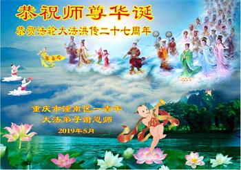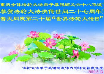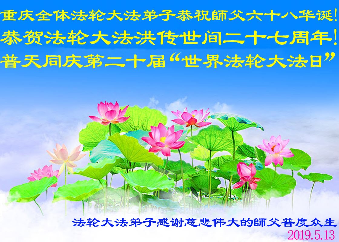 【明慧网二零一九年五月十二日】 重庆市璧山区全体大法弟子恭祝世界法轮大法日!及师尊生日快乐!