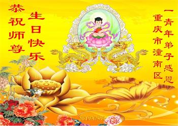 慈悲伟大的师尊: 您好!值此师尊华诞和世界法轮大法日!来临之际, 我们重庆市沙坪坝区十人学法小组全体大法弟子恭祝师尊生日快乐!恭贺第二十届世界法轮大法日!暨大法洪传二十七周年!用尽世间的语言也无法表达弟子们对师尊的无尽感恩。师尊您辛苦了!请师尊放心,我们会遵照您的教诲实修自己,多学法,学好法,认真做好三件事,救度更多众生,走好走正修炼路上的每一步。我们会珍惜这万古不遇的正法机缘和师尊的慈悲苦度,完成我们助师世间行的洪誓大愿,铸就那永恒的威德与辉煌! 重庆市沙坪坝区十人学法小组全体大法弟子叩拜 二零一九年五月八日 重庆市潼南区一青年大法弟子谢恩师!恭祝师尊生日快乐!普天同庆法轮大法洪传世界二十七周年!