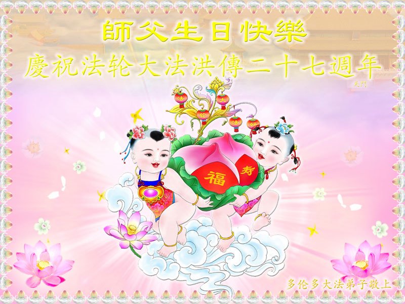 师尊您好!师尊您辛苦了!感恩师尊慈悲救度!在最后的时刻里,弟子一定要努力做好三件事,精進实修,同化大法,随师回家园。 多伦多青年夫妻大法弟子恭祝师父生日快乐!庆祝法轮大法洪传二十七周年!