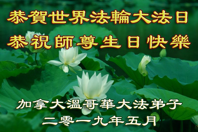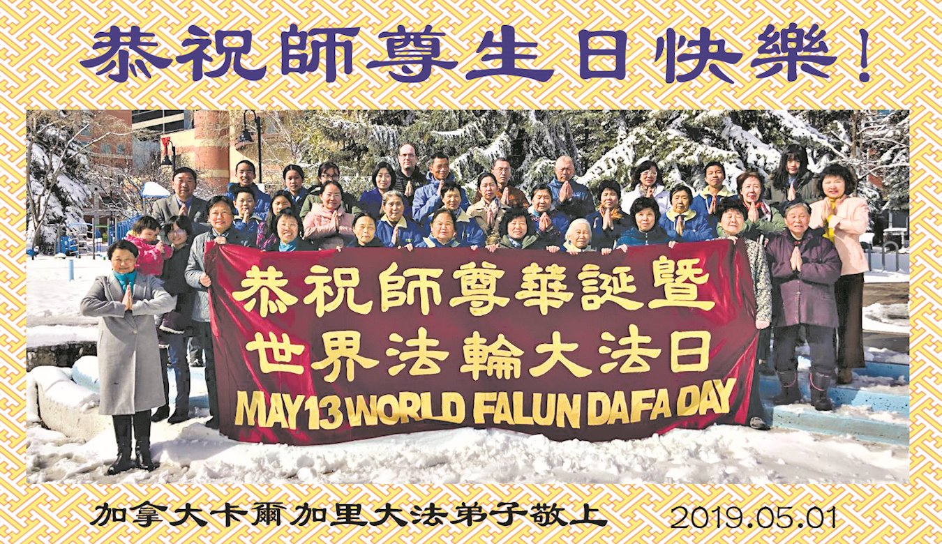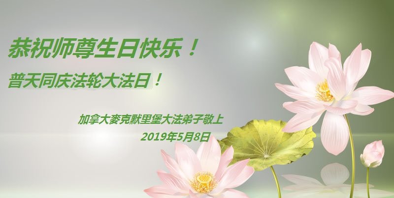 加拿大麦克默里堡大法弟子恭祝慈悲伟大的师尊生日快乐! 2019年5月9日弟子敬上, 合十。 加拿大卡尔加里大法弟子恭贺世界法轮大法日暨师尊华诞!