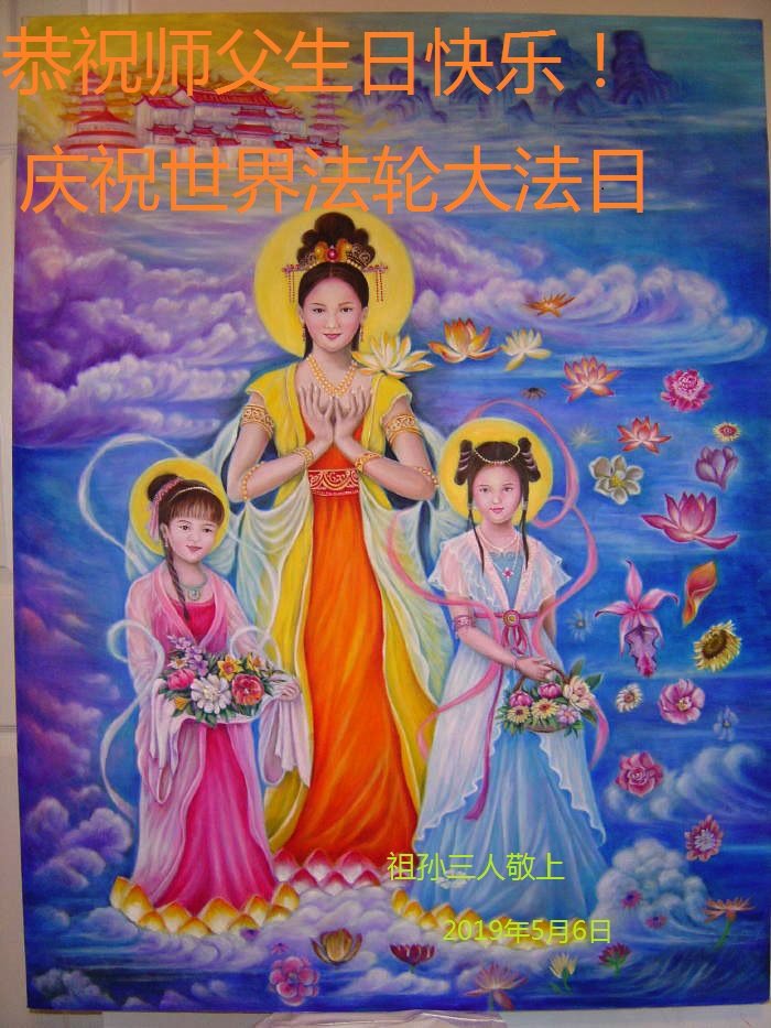 普天同贺世界法轮大法日!恭祝师父生日快乐!庆贺5.13世界法轮大法日! 在5.13这个感恩的日子,我们叩拜师父,我们深知师父度弟子之艰辛,我们会珍惜所剩不多的日子,更加精進修好自己做好三件事,不辜负师父的期望,跟随师父回家!全体大法弟子感恩师尊,叩谢师尊的慈悲苦度。 重庆永川祖孙三人恭祝慈悲伟大的师父生日快乐!庆祝世界法轮大法日!