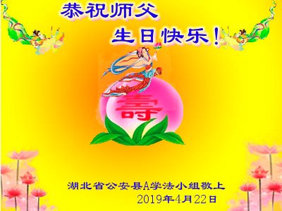 师父您好:我是得法的老年大法弟子,在我修炼的路上,磕磕绊绊走到现在,要没有慈悲的师父保护,也没有我的今天,谢谢师父救度。在今后的日子里,我一定要加倍做好三件事,绝不辜负慈悲师父的苦度,踏踏实实修好自己,做一个合格的大法弟子,跟师父回家。在此恭祝师父生日快乐! 湖北大法弟子 2019年4月10日 湖北省荆州市公安县大法弟子恭祝师父生日快乐!