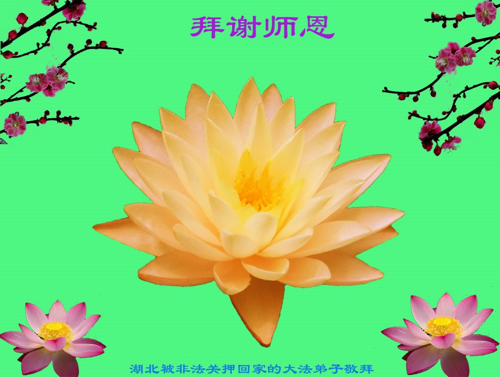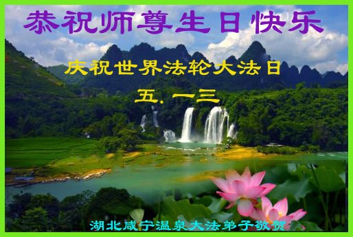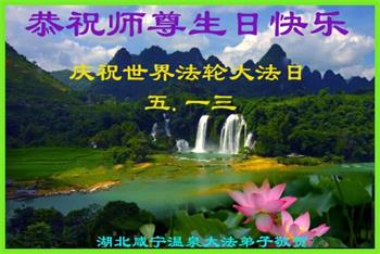 5.13这一天是我们最难忘的日子,是师尊把法轮大法美好的种子在世间开传,他的光明照亮了世界,是众生等待已久、是众生的期盼与渴望,大法唤醒了迷中的世人,启发了人的善良本性,返本归真的归宿。千古难遇的大法带给了我们心灵的轻松祥和与美好,得到他是多么幸运和幸福,把宇宙的真理法轮大法传与众生,是师父的伟大、大法的伟大,得法的弟子与明真相的众生对大法的威德感恩不尽、在苍宇中千古流芳,法正乾坤,永固长存。师父教导我们物质与精神是一性的,提高道德品质、提高思想境界,改变不好的观念是非常重要的,回归五千年神传文化,在新旧宇宙更替的伟大时刻,师父艰辛的付出,为众生承受一切苦难、才有我们今天生命的存在,在万物更新的年代,宇宙芸芸众生被大法的威德震撼,普天同庆,真善忍好!法轮大法好!谢谢师父的慈悲苦度!大法弟子在修炼中有大法的指引、师父的保护、不断的指点,才能使大法弟子在修炼的路上走到今天,大法弟子做好三件事、多救众生,是大法弟子的责任。 湖北省荆州公安县大法弟子恭祝师父生日快乐!