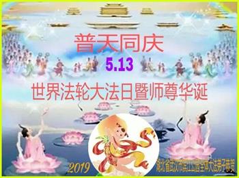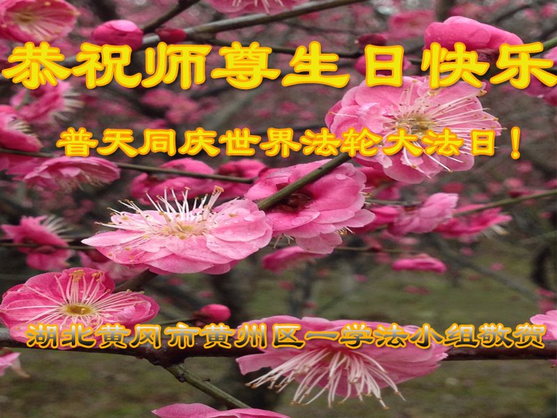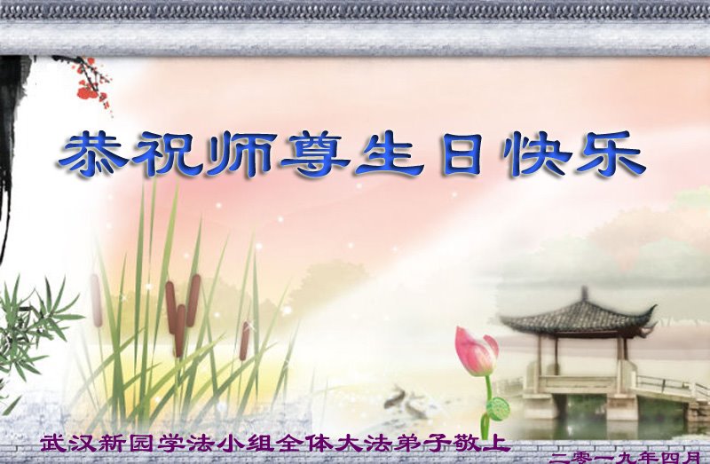 第二十届世界法轮大法日暨师尊六十八华诞即将来临之际,我们学法小组谨以诗的形式敬贺这伟大而神圣的日子! 法轮旋转 寰宇震 驱逐雾霾 天地新 大法洪扬 红潮灭 宇宙更新 救众生 佛光普照 世中人 大法溶入 众生心 亿万颗心 亿万人 心中共有 真善忍 法光沐浴 心性升 法理清晰 修炼真 法徒成熟 路走正 人心不动 佛道神 精進实修 勇猛進 三件事情 要认真 救度众生 是重任 兑现誓约 谢师恩 武汉新园学法小组 二零一九年四月 湖北黄冈市黄州区一学法小组敬贺师尊生日快乐!恭祝第二十届世界法轮大法日!