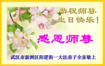 恭祝师尊生日快乐! 是慈悲伟大的师父将我从地狱捞起,传给我宇宙大法,从而道德得到升华。在江氏邪恶流氓集团对法轮功的迫害中,我摔过跟头,走过弯路,但师父没有放弃我这个不争气的弟子,为弟子承受的太多。感谢伟大师父的慈悲苦度,弟子一定要走好以后的正法修炼道路,圆满随师还。 弟子叩谢师恩! 二零一九年五月七日 湖北省武汉市新洲区阳逻街一位大法弟子及全家人恭祝慈悲伟大的师尊生日快乐!