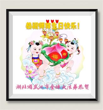 尊敬的师父您好:我们想念您,真心希望师父早日回大陆。在以后修炼的日子里,我们一定听您的话,做好三件事,时时向内找,实修自己,跟师父回家。 再次恭祝师父生日快乐! 湖北省武汉大法弟子恭祝师尊生日快乐!恭祝师尊洪传大法廿七周年!