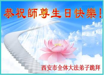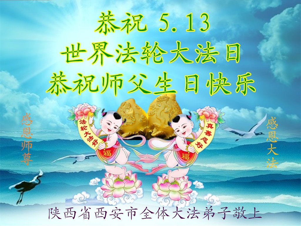 陕西省西安市全体大法弟子庆祝5.13世界法轮大法日!恭祝师父生日快乐!