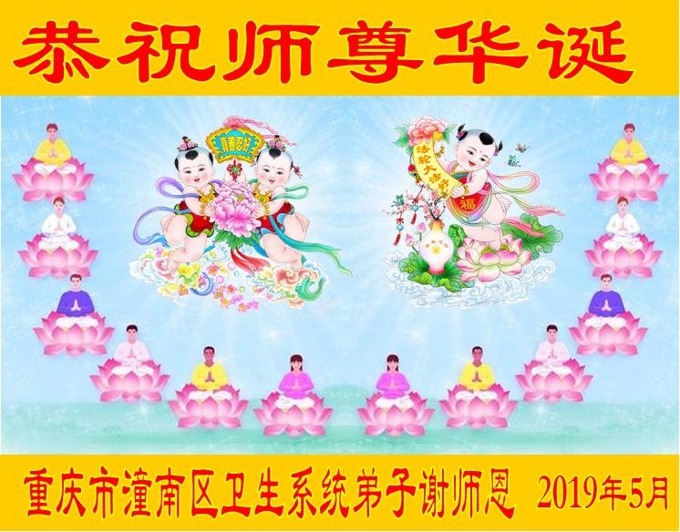 师尊您好,在5.13世界法轮大法日到来之际,弟子叩谢师尊。 回顾我在江氏邪恶集团这二十年的迫害中跌跌撞撞一路走来,都是在师尊无微不至的关怀下领着弟子走上返本归真之路,每一步都浸透了师尊的心血。千言万语无法表达弟子对师尊的感恩。 在今后的岁月里,弟子要更加精進,遵照师尊教诲,学法修心,遇事向内找,做好三件事,圆满随师还。 叩谢师恩! 辽宁丹东五龙背大法弟子敬上 2019年5月1日 四川遂宁四个学法小组全体大法弟子恭祝师父生日快乐!