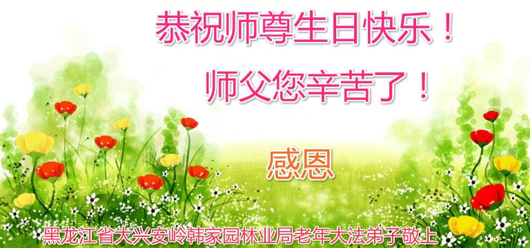 慈悲伟大的师尊好!您辛苦了!谢谢师父的慈悲救度! 跪拜师尊!感恩师尊慈悲救度! 黑龙江原农垦系统大法弟子普天同庆世界法轮大法日!恭祝师父生日快乐!