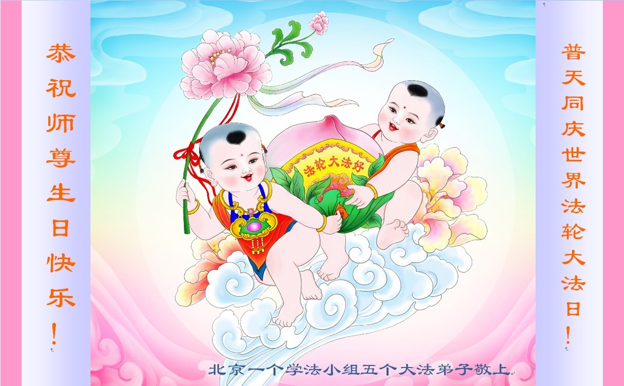 师父您好!师父您辛苦了!感谢师尊慈悲苦度!任何艰难险阻都动摇不了弟子坚修大法的心。弟子唯有勇猛精進,做好师尊要求的三件事,惟愿师尊笑! 北京一个学法小组五个大法弟子恭祝师尊生日快乐!
