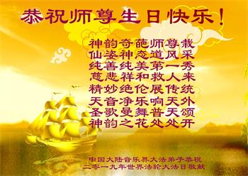 恭祝师尊生日快乐! 神韵奇葩师尊栽 仙姿神态道风采 纯善纯美第一秀 慈悲祥和救人来 精妙绝伦展传统 天音净乐响天外 圣歌曼舞普天颂 神韵之花处处开 中国大陆音乐界大法弟子恭祝 二零一九年世界法轮大法日敬献 大陆青年大法弟子庆祝法轮大法洪传二十七周年!