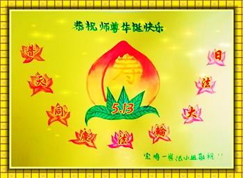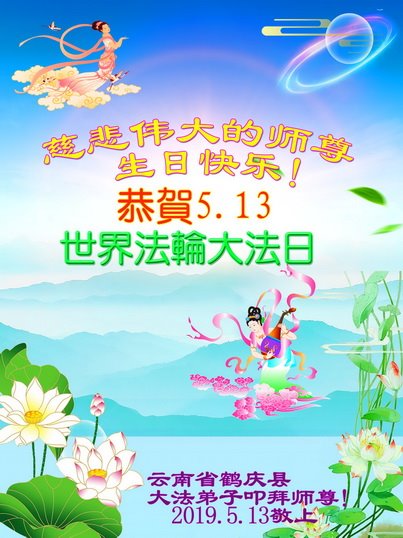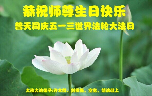 我修炼法轮大法20年了,法轮大法给我带来了意想不到的身体健康与美好的心灵净化,同时赐予我智慧和能力,在我危难时,大法师父无私的保护我,我越来越感受到法轮大法的无比珍贵和师父的无比伟大慈悲!法轮大法是佛家上乘修炼大法,这万古不遇的机缘让我遇到了,我感到无比幸运! 值此一年一度的世界法轮大法日来临之际,我献上对法轮大法与师父深深的感恩与美好的祝愿,祝法轮大法能得到更蓬勃的发展和更广泛的洪扬;祝伟大的师父生日快乐时,也盼望更多的世人,在这正邪同在的末法乱世,能理智清醒,本着善良与正义,站在道德与法制的基点,能看到法轮大法的美好,认清中共恶党迫害的罪恶,在善与恶之间做出正确选择,以保证自己平安渡过最后大劫,走向美好的未来! 大陆老俩口大法弟子恭祝慈悲伟大的师父生日快乐!