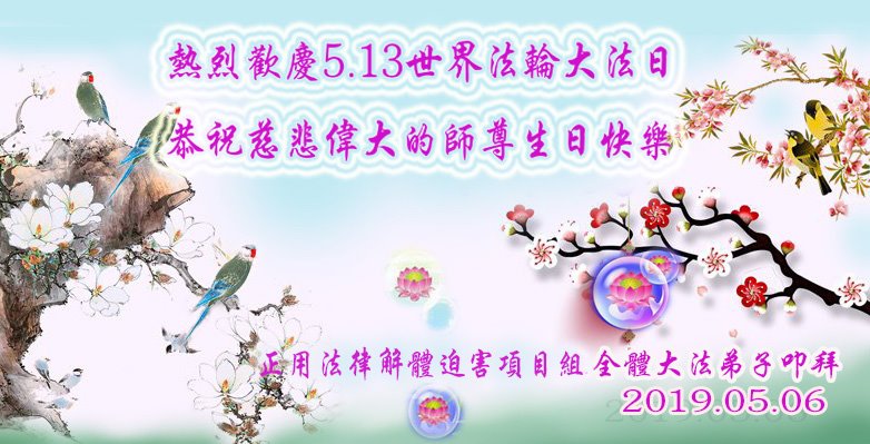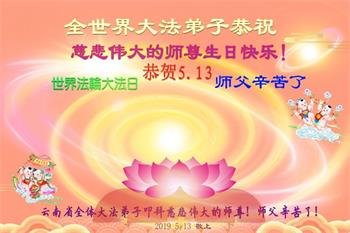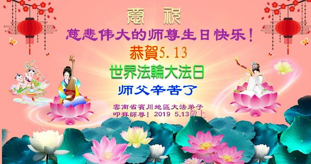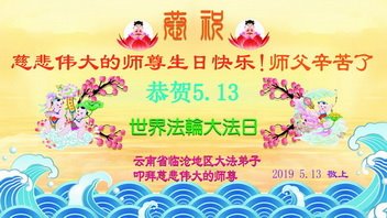 普天同庆“5·13”世界法轮大法日!全体长春大法弟子恭祝师尊生日快乐! 祝师尊六十八岁华诞快乐! 弟子倾尽生命的一切难报师尊救命之恩!师尊大慈大悲给了弟子第二次生命。在正法最后的时间里,弟子只有精進精進,修好自己,多救人,让师尊多一份欣慰,少一份操劳! 弟子跪拜师尊 2019年5月9日 祝慈悲伟大的师尊生日快乐! 难忘的“5·13”这一天,是伟大的师尊68岁华诞,同时又是5·13世界法轮大法日!佛光普照,普天同庆,在这幸福的时刻,弟子怀着崇敬的心情,借助明慧这个平台,向慈悲伟大的师尊献上一份生日的祝愿,祝师尊生日快乐!愿师尊少一份操劳,多一份欣慰! 弟子是幸运的,与师同在与法同在,师恩难报啊!弟子只有精進实修,做好师父安排的三件事,多救人,圆满随师还! 长春大法弟子 2019年5月10日 长春大法弟子恭祝师尊生日快乐!师父辛苦了! 陕西省宝鸡一学法小组大法弟子恭祝师尊生日快乐!同贺五·一三世界法轮大法日!