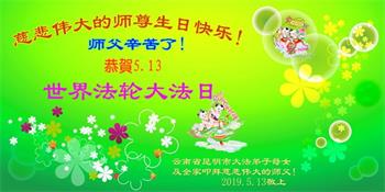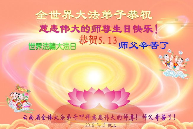 在这普天同庆的日子里,我们衷心感谢大法师父,感恩大师的浩荡佛恩!大法师父好!“法轮大法好”、“真善忍好”! 大陆大法弟子及家人恭祝慈悲伟大的师尊生日快乐!普天同庆同贺世界法轮大法日!