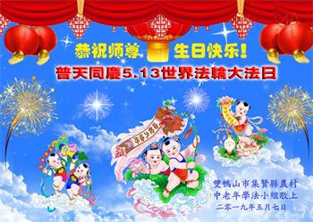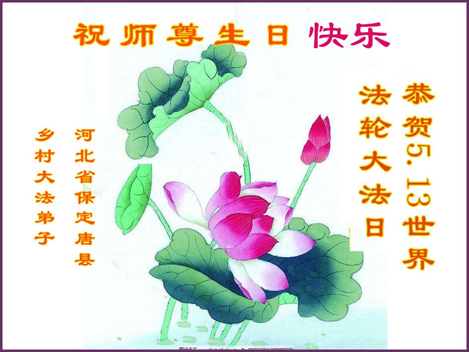 5月13日是全世界法轮大法日,也是我们伟大的师尊华诞,农村老弟子恭祝师父生日快乐!师父您好,您辛苦了!你为弟子们操尽了心,弟子们无法用人类语言表达对师父的敬意,只有精進实修修去人心,才能报答师父的慈悲与苦度! 河北迁安市农村大法弟子敬上 河北省保定市唐县乡村大法弟子叩拜师尊!恭祝慈悲伟大的师尊生日快乐!恭贺5.13世界法轮大法日!