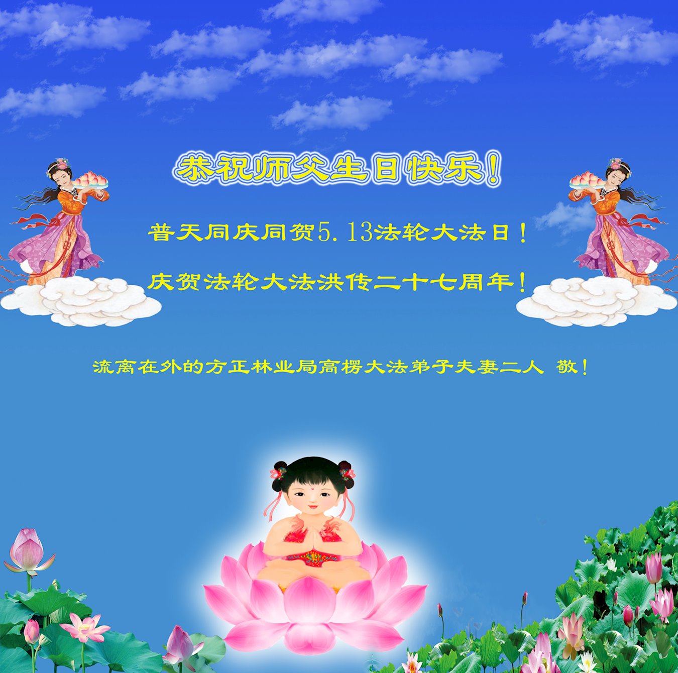 流离在外的方正林业局高楞大法弟子夫妻二人恭祝师父生日快乐!普天同庆同贺5.13法轮大法日!