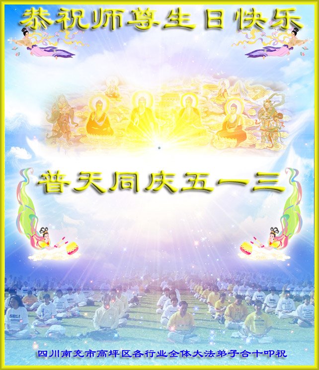 我们四川南充市高坪区各行业全体大法弟子在“五一三”即将来临之际,怀着对师尊无限感恩的心:恭祝无量慈悲伟大的师尊生日快乐!喜庆法轮大法洪传二十七周年暨第二十届世界法轮大法日!谢谢师尊的慈悲普度!您辛苦了!弟子们会继续互相配合好,形成整体做好三件事,多救人,不负师恩。四川南充市高坪区各行业全体大法弟子合十叩祝! 中国大陆统计系统大法弟子庆祝5.13世界法轮大法日!恭祝师父生日快乐!