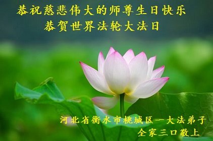 何北石家市一大法弟子恭祝师尊华诞生日快乐!恭祝法轮大法日! 弟子一定抓紧最后不多的时间,努力修好自己,多救人。千言万语道不尽弟子的感恩,每当此时都是泪水无声的流。唯有多学法,精進再精進,不被人间名利情干扰,诱惑,兑现誓约,圆满随师还。 河北省衡水市桃城区一大法弟子全家恭祝师尊生日快乐!恭贺世界法轮大法日!
