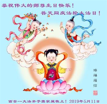 陕西省西安一大法弟子携女儿外孙恭祝伟大慈悲的师尊生日快乐!