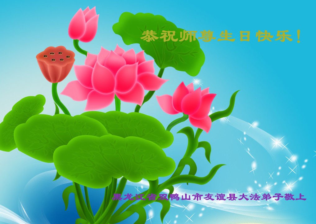 黑龙江省牡丹江大法弟子恭祝师尊生日快乐!普天同庆5.13世界法轮大法日! 师尊伟大慈悲救苍生,佛恩浩荡临危正大穹。珍惜万古圣缘师恩重,精進实修惟愿师尊笑。 黑龙江省双鸭山市友谊县大法弟子恭祝师尊生日快乐!