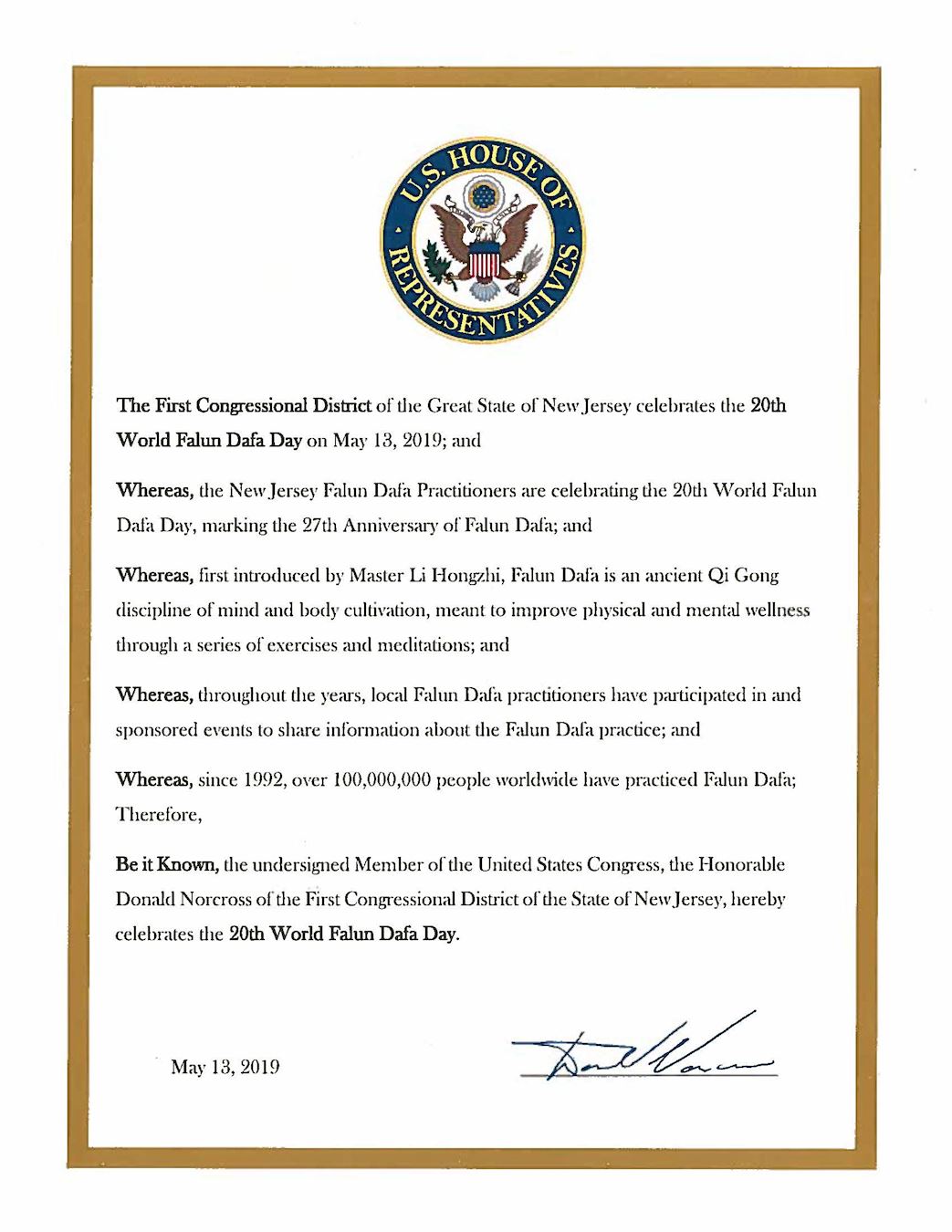 第一选区国会众议员唐纳得·纳克劳斯(Donald Norcross) 签发国会褒奖状指出,在新泽西州法轮大法学员庆祝第二十届世界法轮大法日之际,新泽西州第一国会选区的居民也将在五月十三日庆祝世界法轮大法日。他赞扬当地的法轮大法学员多年来在该地区推广法轮大法的努力。  图2:国会众议员唐纳得·纳克劳斯(Donald Norcross) 签发的国会褒奖状 |