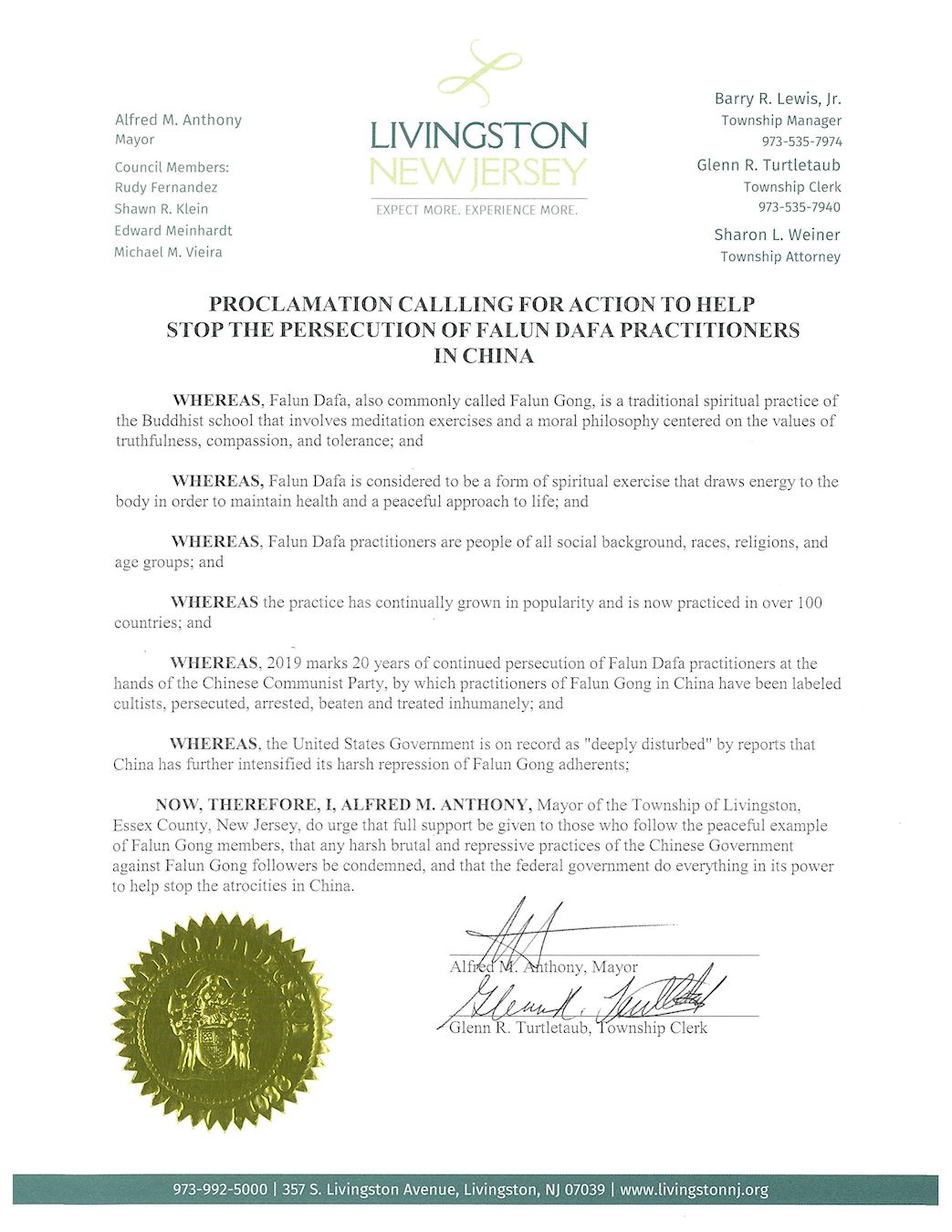 第十二选区国会众议员邦妮·科勒曼(Bonnie Watson Coleman) 向新泽西州法轮大法学会发来贺信,指出世界法轮大法日是为了铭记这一世界上最广受欢迎修炼功法之一的日子。赞扬法轮大法已引导全世界成百万人遵循真善忍的原则。这项美丽的传统功法深深地源自于中国传统文化,并将我们的社区团结在一起。 新泽西州埃塞克斯县(Essex)行政长官约瑟夫·迪文山宙(Joseph N. DiVincenzo, Jr.) 在贺信中指出,法轮大法在新泽西州广受欢迎,定期在老人中心,公司,健康俱乐部,公园和图书馆等地方炼功,这是在本州岛内广范传播的见证。 新泽西州最大城市纽瓦克市市长拉斯·巴拉克(Ras Barak)发来褒奖信,代表所有纽瓦克市居民,恭祝法轮大法学会庆祝世界法轮大法日。法轮大法使各个年龄的人群身心受益,我们以你们成为我们社区的一部份而感荣幸。 李文斯顿市(Livingston) 市长阿菲尔得·安东尼(Alfred Anthony)发布褒奖状指出,法轮大法学员来自社会各阶层不同年龄,社会背景,种族,在全世界100多个国家广受欢迎。据美国政府记载,中国大陆还在持续加剧对法轮功学员的迫害。我呼吁给坚持和平理念的法轮功学员给以全力支持,呼吁美国政府尽其所能帮助立即停止对法轮功学员的残酷迫害。  图3:李文斯顿市市长阿菲尔得·安东尼(Alfred Anthony)发布的褒奖状 |