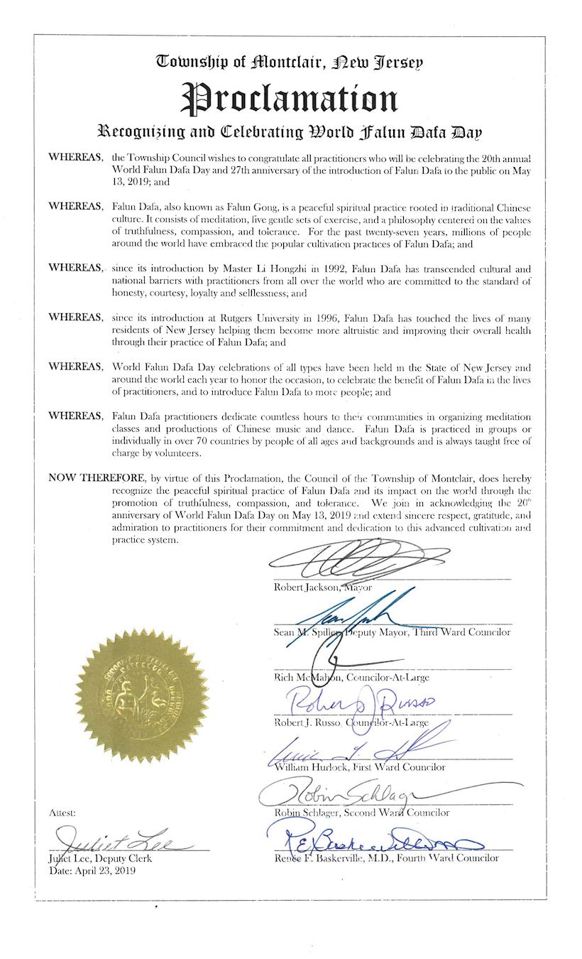 锡卡克斯市(Secaucus )市长麦克·宫奈力(Michael Gonnelli )为世界法轮大法日的到来发来贺信, 指出法轮大法源自于中国传统文化,他赞扬法轮大法学员在社区广范传播的努力,使社区受益。 蒙特克莱尔市(Montclair)市议会发布褒奖令,由市长罗伯特·杰克逊(Robert Jackson) 和所有六位市议员共同签署。褒奖指出,法轮大法自一九九二年由李洪志大师开传以来,已跨越国界,广传世界。赞扬法轮大法的平和精神修行,以及通过传播真善忍原则给世界带来的美好作用。  图4:蒙特克莱尔市(Montclair)市议会发布的褒奖令 |