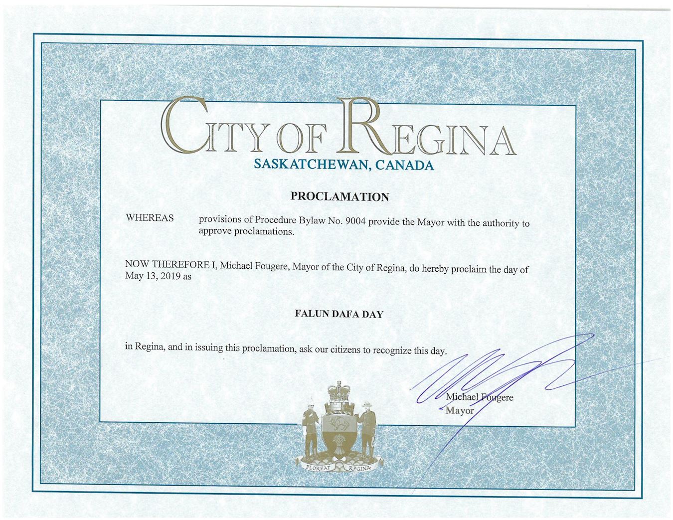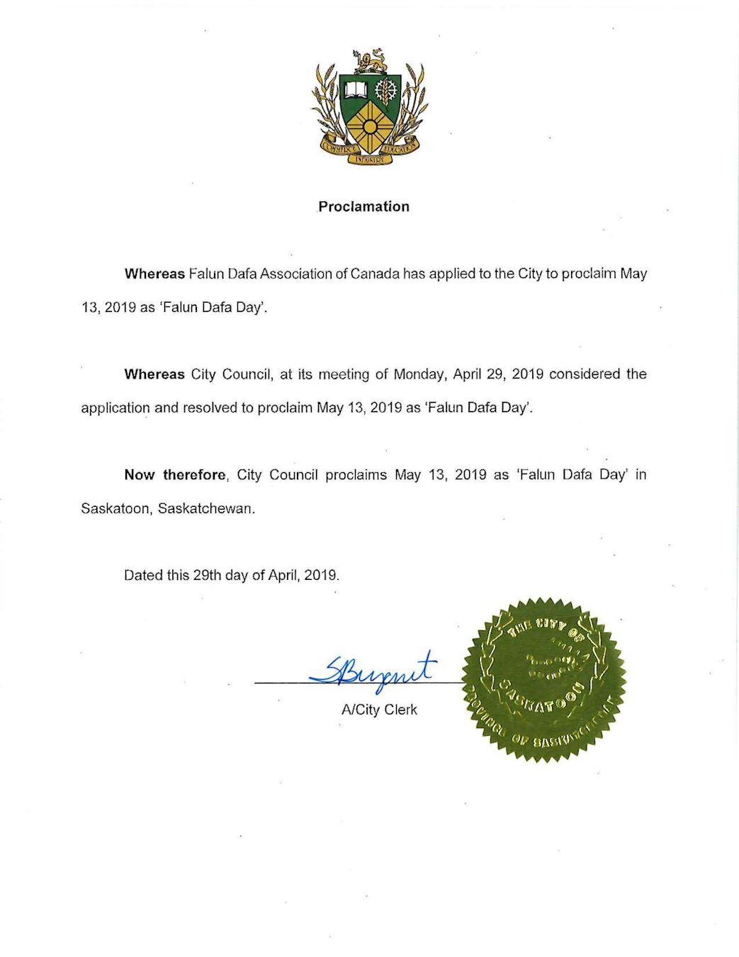 萨斯喀彻温省首府里贾纳市长Michael Fougere宣布2019年5月13日为里贾纳“法轮大法日”,并褒奖法轮大法。  图4:萨斯喀彻温省最大城市萨斯卡通市褒奖法轮大法。 |