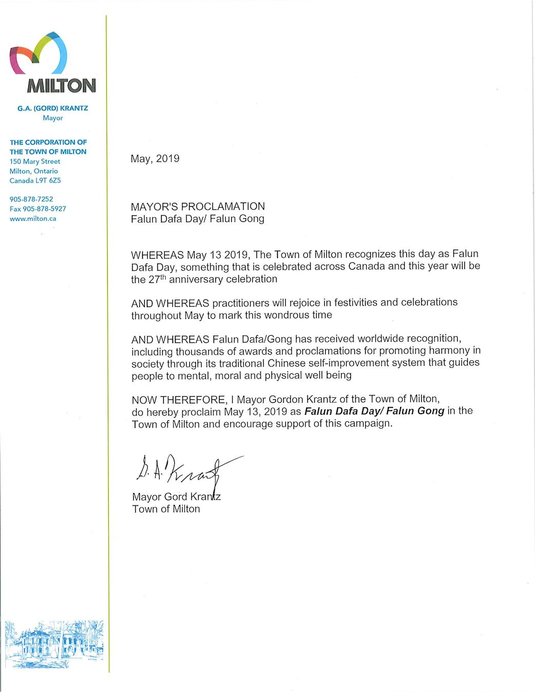 萨斯喀彻温省最大城市萨斯卡通市宣布2019年5月13日为萨斯卡通“法轮大法日”,并褒奖法轮大法。  图5:安省密尔顿(Milton)市长Gord Kratz褒奖法轮大法。 |