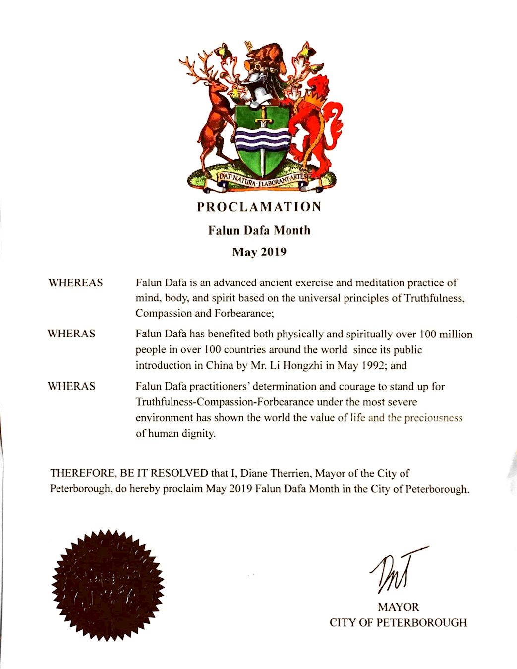 安省密尔顿(Milton)市长Gord Kratz宣布2019年5月13日为密尔顿“法轮大法日”,并褒奖法轮大法。  图6:安省彼得堡(Peterborough)市长Diane Therrien褒奖法轮大法。 |