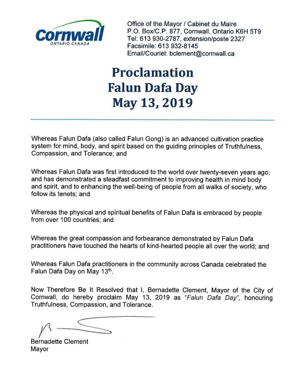 安省彼得堡(Peterborough)市长Diane Therrien宣布2019年5月为彼得堡“法轮大法月”,并褒奖法轮大法。  图7:安省康沃尔(Cornwall)市长Bernadette Clement褒奖法轮大法。 |